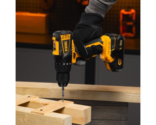 - Универсальность — дрель-шуруповерт совместима с любым Li-Ion аккумулятором и зарядным устройством единой платформы Denzel Battery System 18V.