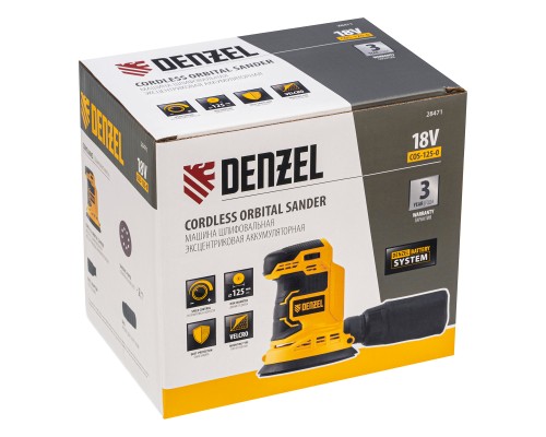 - Универсальность — к шлифовальной машине подходит аккумулятор 4Ач Li-ion, совместимый с любым инструментом 18V Denzel battery system серии IB (в комплект поставки не входит).