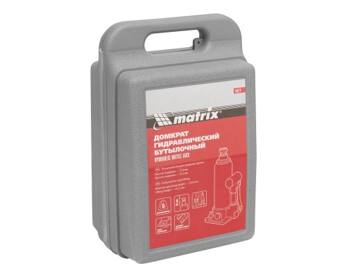 Гидравлический бутылочный домкрат Matrix 50777 позволяет быстро поднимать грузы массой до 6 т на высоту 216-413 мм. Встроенный магнитным уловитель собирает металлическую стружку, предотвращая преждевременный износ резиновых уплотнителей. Домкрат пригодится для полупрофессионального применения.