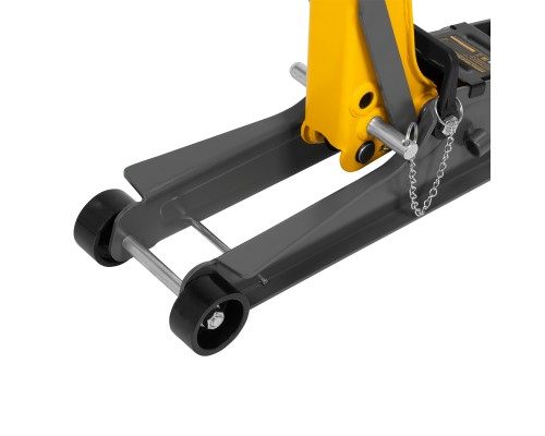 Гидравлический подкатной домкрат Denzel 51233 с фиксатором, поставляющийся в кейсе, имеет высоту подхвата 85 мм и предназначен для плавного подъема грузов массой до 2,5 т на высоту до 385 мм. Страховочный штифт позволяет фиксировать подъемный рычаг на высоте 290 и 355 мм для безопасной работы. Домкрат пригодится владельцам легковых автомобилей с низким и стандартным клиренсом.