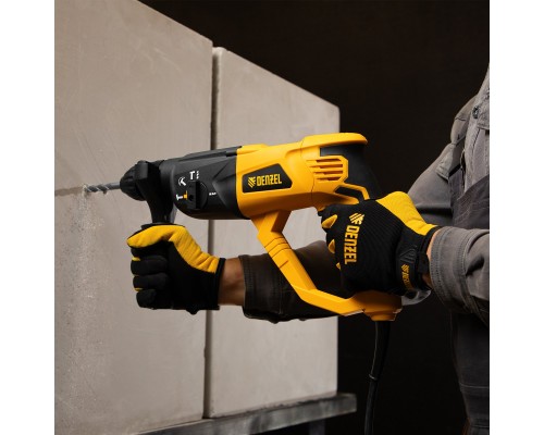 Электрический перфоратор Denzel RH-1050-26 26608 мощностью 1050 Вт, с патроном под хвостовик SDS-plus, имеет 3 плюс 1 режим, развивает энергию удара 3,2 Дж и используется для проведения отделочных и монтажных работ в режиме сверления, бурения и долбления. Эффективно работает с твердыми материалами. Максимальный диаметр отверстий в бетоне составляет 26 мм, в древесине — 40 мм, металле — 13 мм.