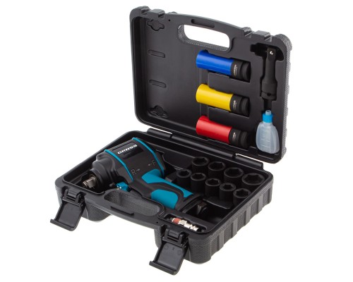 Пневматический ударный гайковерт Gross G985K2 57445 с максимальным крутящим моментом 610 Нм и присоединительным квадратом 1/2″, с частотой вращения шпинделя 9000 об/мин, входит в набор из 17 предметов и упрощает закручивание/раскручивание резьбовых высоконагруженных соединений на винтах, болтах и гайках. Для него подойдет маломощный компрессор, т.к. инструмент расходует небольшое количество воздуха от 120 л/мин. Гайковерт применяется как в быту, так и в профессиональной сфере — в гараже, сборочном цехе, автосервисе, на строительной площадке.