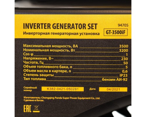 Инверторный генератор Denzel GT-3500iF 94705 мощностью 3,5 кВт, в открытом корпусе, с ручным стартом, — легкий и экономичный, но при этом достаточно мощный, с ним легко справится даже неопытный пользователь. Идеально подходит для использования на даче, в гараже, в мастерской и на природе. Четырехтактный двигатель Denzel Long Life мощностью 7 л.с. и объемом 212 куб. см работает стабильно и имеет относительно невысокий уровень шума (97 дБ) и вибраций. Прочная рама защищает рабочие элементы от повреждений в процессе работы и транспортировки.