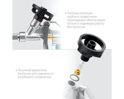 - Регулятор подачи пены имеет лёгкий и точный ход, а также предотвращает вращение игольчатого клапана, приводящее к быстрому износу прокладок