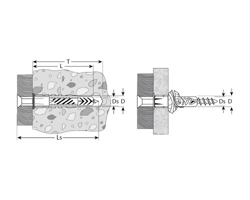 Для монтажа элементов и конструкций к полнотелым (бетон, кирпич, природный камень), пустотелым (кирпичи с пустотами, блоки и т.п.) и тонкостенным (фанера, ДСП, гипсокартон и т.п.) строительным материалам. Фиксация дюбеля происходит при вкручивании в него самореза (входит в комплект поставки). Диаметр предварительного сверления: 10 мм.