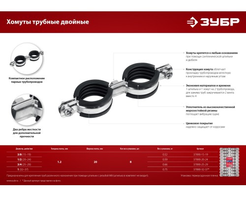 ЗУБР 1″, цинк, 8 шт, двойной трубный хомут (37890-32-37)