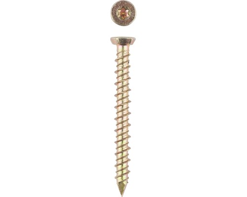Шурупы по бетону изготовлены из стального прутка с высоким содержанием углерода. Контроль за геометрией шурупа начинается с калибровки прутка и заканчивается тщательной проверкой размеров готового изделия. Улучшенная геометрия и специально разработанная форма резьбы предназначены для жесткой фиксации конструкций в бетоне. Перед вкручиванием шурупа требуется предварительное сверление. Головка самореза имеет шлиц TX30. Геометрические размеры: диаметр головки (Dk) - 10.8-11.8мм, диаметр высокой резьбы (D) - 7.4-7.6мм, шаг резьбы (Pi) - 5.2мм.