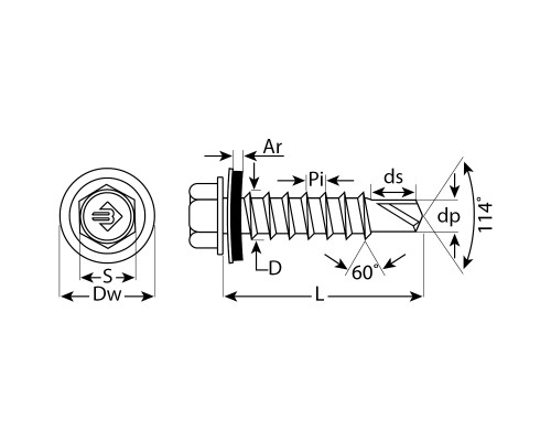 Кровельные саморезы изготовлены из стального прутка с высоким содержанием углерода. Контроль за геометрией самореза начинается с калибровки прутка и заканчивается тщательной проверкой размеров готового изделия. Нормативная твердость стали достигается термической обработкой. Поверхностная твердость мин. 560HV, твердость в сердцевине 240-425HV. Шайба с прокладкой EPDM плотно прижимается к кровельному материалу, герметизируя просверленное отверстие. Шестигранная головка выдерживает большой крутящий момент и значительно облегчает вкручивание самореза. Геометрические размеры: диаметр шайбы (Dw) - 13.90-14.15мм, толщина прокладки (Ar) - 2мм, Размер под ключ (S) - 7.8-7.9мм, диаметр резьбы (D) - 4.75-4.95мм, диаметр сверла (dp) - 2.8-2.9мм, длина сверла (ds) - 4.0-4.8мм, шаг резьбы (Pi) - 2.12мм.