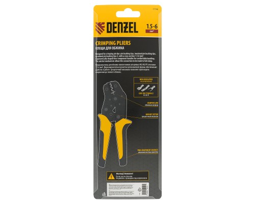 Клещи Denzel 17746 предназначены для обжима неизолированных кольцевых наконечников НК и вилочных НВ, разъемов плоских РП сечением 1,5-6 мм². Инструмент пригодится частным и профессиональным мастерам при проведении электромонтажных работ.
