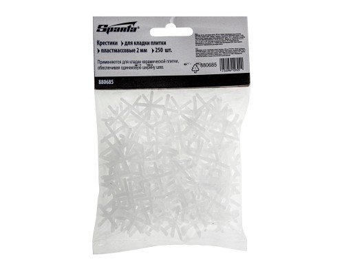 Крестики для кладки плитки Sparta 880685 толщиной 2,0 мм, 250 шт. в упаковке, позволяют добиться одинакового межплиточного расстояния в ходе облицовочных работ. Облегчают укладку плиточного покрытия и обеспечивают ему эстетичный внешний вид.