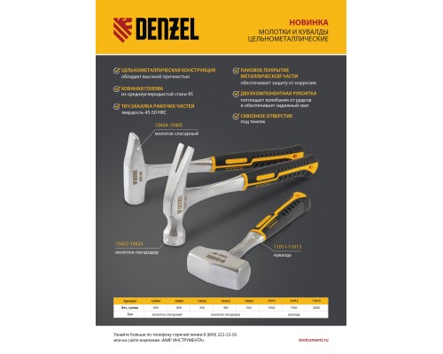 Цельнометаллический слесарный молоток Denzel 10405 с головкой весом 800 г и двухкомпонентной рукояткой предназначен для работы с металлическими заготовками, забивания гвоздей, штырей, дюбелей и других крепежных элементов. Необходим во время строительства, ремонта, сборки и установки мебели, также пригодится дома, на даче и в гараже. Инструмент рекомендован для профессионального и домашнего применения.