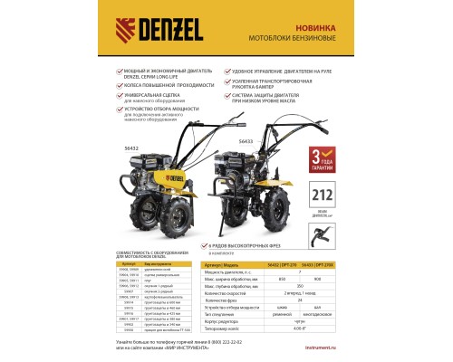 Мотоблок Denzel DPT-270X 56433 с двигателем объемом 212 см3 и мощностью 7 л.с., дисковым сцеплением, валом отбора мощности (ВОМ) и..