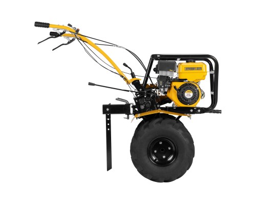 - Повышенная проходимость — мотоблок оснащен тракторными пневматическими колесами.