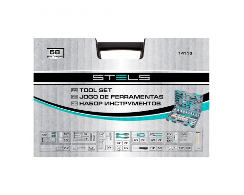 Набор инструментов Stels 14113, 1/2 дюйма, из сталей CrV и S2, состоит из 58 предметов и упакован в усиленный пластиковый кейс. Предназначен для слесарно-монтажных работ дома или в гараже. Включает инструменты для монтажа и демонтажа резьбовых соединений, захвата и удержания деталей, а также ударных работ. Кейс из ударопрочного жесткого пластика, с металлическими застежками, позволяет перевозить набор в багажнике автомашины.
