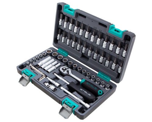 Набор инструментов Stels 14101 в пластиковом кейсе включает в себя 57 предметов с присоединительным размером 1/4 дюйма из стали CrV. Он применяется для монтажа и демонтажа резьбовых соединений во время обслуживания и ремонта авто, а также выполнения бытовых работ. Инструменты пригодятся автолюбителям и домашним мастерам.