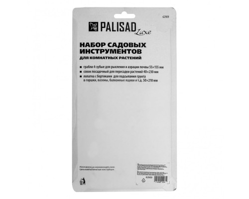 Набор по уходу за комнатными растениями Palisad LUXE 62909 состоит из 3 цельнометаллических предметов и позволяет рыхлить, вскапывать, насыпать грунт, формировать лунки и борозды. Материал инструментов — нержавеющая сталь, поэтому они не боятся коррозии и прослужат долго. Набор будет полезен любителям домашнего растениеводства и владельцам дачных участков.