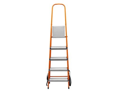 Стремянка оранжевая Сибртех 97965 со стальным профилем и 5 ступенями из стали используется, чтобы достать нужный предмет с антресолей или высокой полки, вытереть пыль на шкафу, заменить лампочку в люстре, а также решить другие бытовые вопросы. Также будет полезна для выполнения малярных и монтажных работ. Лестница рассчитана на нагрузку до 150 кг. Площадка находится на высоте 101,5 см от опорной поверхности, рабочая высота стремянки составляет 301,5 см (при среднем росте пользователя 170 см). Стремянка имеет широкое основание и характеризуется устойчивостью.