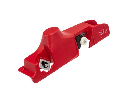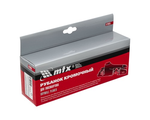 Пластиковый кромочный рубанок для гипсокартона MTX 879055 позволяет обрезать края гипсокартонных листов под углом 22,5° или 45°, для чего на нем установлены 2 ножа. Положение переднего лезвия, снимающего фаску под углом 22,5°, регулируется в зависимости от толщины листа — 9,5, 12,5, 15 мм или более. Инструмент используется для проведения отделочных работ.
