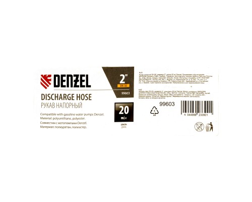 Напорный рукав Denzel DH-50 99603 диаметром 2" и длиной 20 м выдерживает рабочее давление 1 МПа и предназначен для подачи воды от мотопомпы к месту водоразбора или тушения пожара. Совместим с мотопомпами Denzel 99201 и 99203.