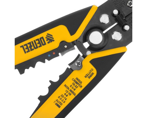 Щипцы Denzel 17742 — инструмент для зачистки электропроводов сечением 0,2-6 мм2 (22-10 AWG), способный дополнительно выполнять функцию обрезания проводов. Используется при проведении электромонтажных работ, подходит для профессионального применения.