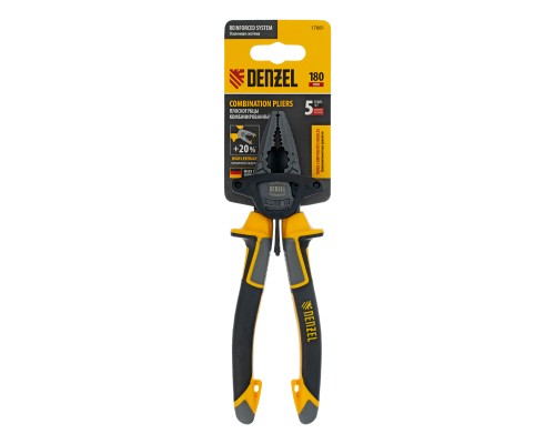 Комбинированные плоскогубцы Denzel 17081 длиной 180 мм, с трехкомпонентными рукоятками, используются для зажима и удержания деталей, перекусывания мягкой и жесткой проволоки, сгибания металлических листов. Имеют внутренние грани специальной формы, позволяющие использовать инструмент в качестве гаечного ключа. Губки с насечками надежно удерживают заготовки. Плоскогубцы пригодятся профессионалу и частному мастеру при проведении слесарных, ремонтных и сборочных работ.