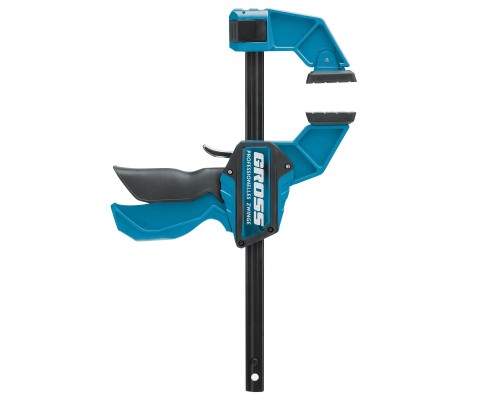 Реечная быстрозажимная струбцина Gross 20700 пистолетного типа, с пластиковым корпусом, с шириной зажима 150 мм, с пошаговым механизмом, используется для зажимания заготовок при выполнении столярных или монтажных работ. Удобна для фиксации деревянных деталей, т. к. пластиковые накладки на губках не повреждают их поверхность при сжатии. Подвижная губка пошагово перемещается по рейке, постепенно зажимая обрабатываемый предмет. Курковый фиксатор удерживает ее в заданном положении. Инструмент рекомендован для профессионального использования.