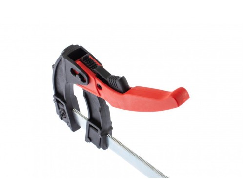 Реечная быстрозажимная струбцина Matrix 20737, 250 х 90 х 340 мм, штанга 5 х 20 мм, с пластиковым корпусом и рычажным храповым механизмом, используется для зажимания и удержания заготовок с целью их скрепления или последующей обработки. Рычажно-храповый механизм позволяет надежно зафиксировать деталь, пошагово перемещая подвижную губку вдоль штанги. Струбцина пригодится при выполнении столярных работ в мастерской, дома или на даче.