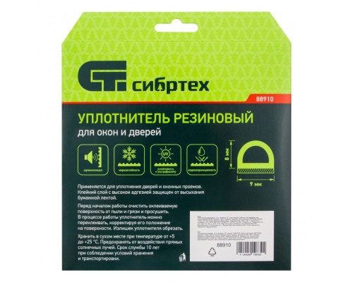 Коричневый резиновый уплотнитель Сибртех 88910 длиной 12 м, профиль «D», предназначен для герметизации и уплотнения оконных и дверных блоков с целью исключения сквозняков и вибраций, защиты от влаги и пыли, создания эффективной тепло- и звукоизоляции. Изделие снижает энергетические и экономические затраты. D профиль 9 x 8 мм подойдет для щелей размером 3-7 мм.
