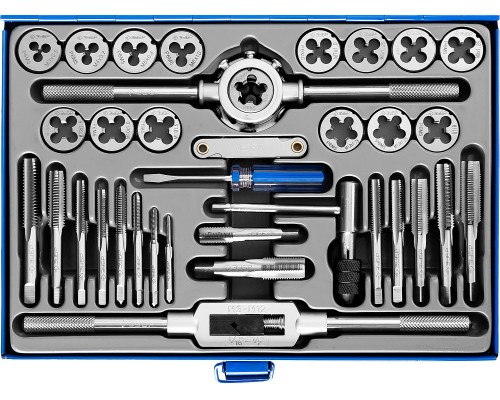 Набор предназначен для нарезания и калибрования внутренней и внешней метрической и трубной резьбы в сквозных и глухих отверстиях в сталях с пределом прочности до 900Н/мм2, цветных металлах, пластике.