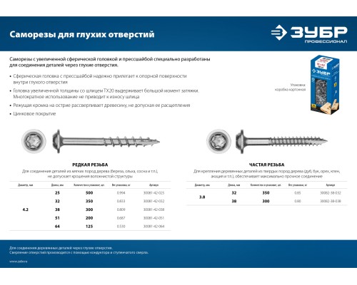 ЗУБР 38 х 3.8 мм, частая резьба, цинк, 300 шт, саморез для глухих отверстий, Профессионал (30082-38-038)